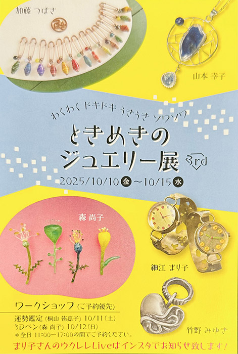 ときめきのジュエリー展 3rd森尚子、小川真由美、近藤依子、西川智子、山本幸子【時間】11:00~17:00 【会場】喫茶ギャラリー ムース 【住所】〒501-3265 岐阜県関市小瀬1212-1 |