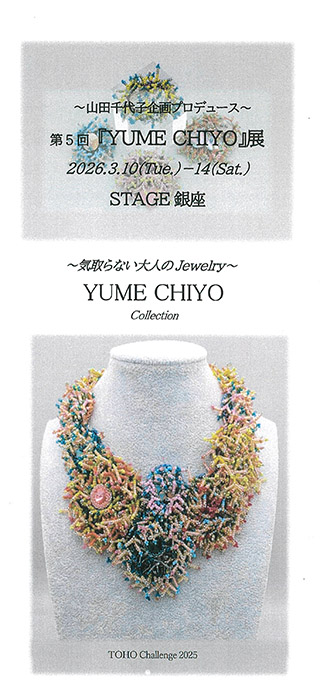 第5回『YUME CHIYO』展山田千代子【時間】11:00~18:00 ※最終日は15:00 【会場】STAGE 銀座 【住所】〒104-0061 東京都中央区銀座8-5 【お問合せ】090-4144-5445 |